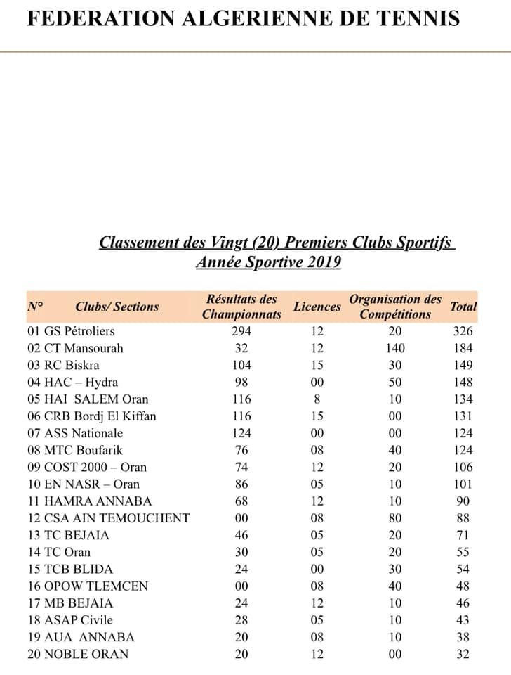 Dans le cadre de l’organisation de l’Assemblée Générale Ordinaire, la Fédération Algérienne de Tennis communique la liste des (vingt) 20 premiers Clubs après la saison sportive 2019, établie sur les bases des résultats suivants :
