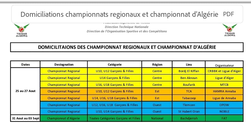 Nous vous rappelons que le championnat d’Algérie se tiendra du 31 au 03 Septembre au Tennis Club de Bachdjerrah.