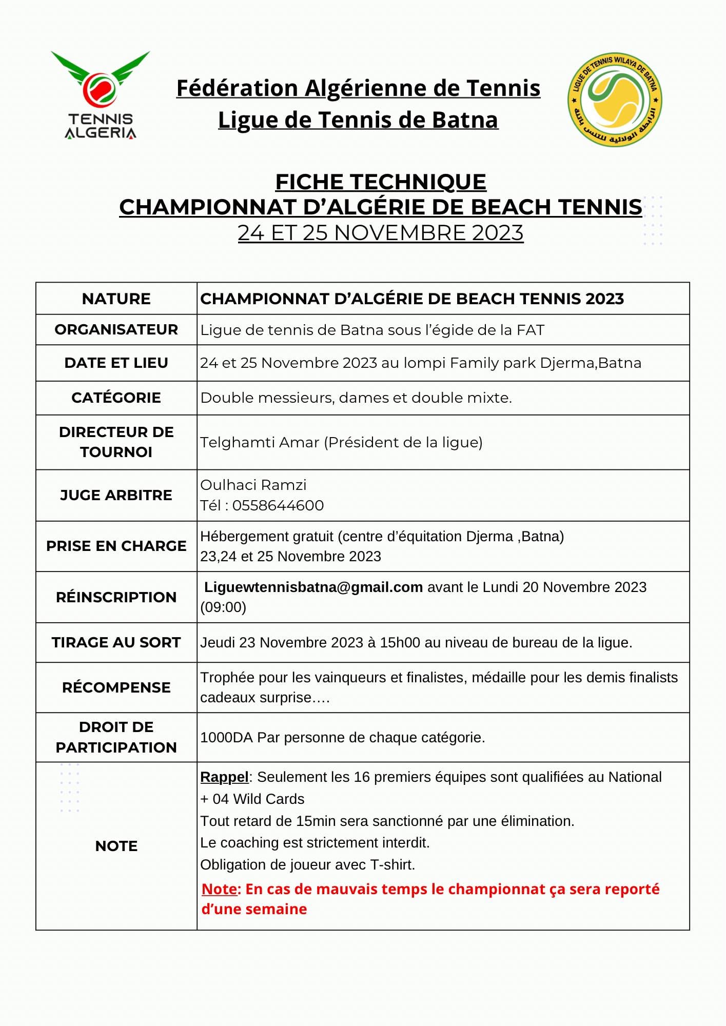 En attache, la Fiche technique du Championnat d’Algérie de Beach-Tennis, programmé les 24 et 25 Novembre à Batna.