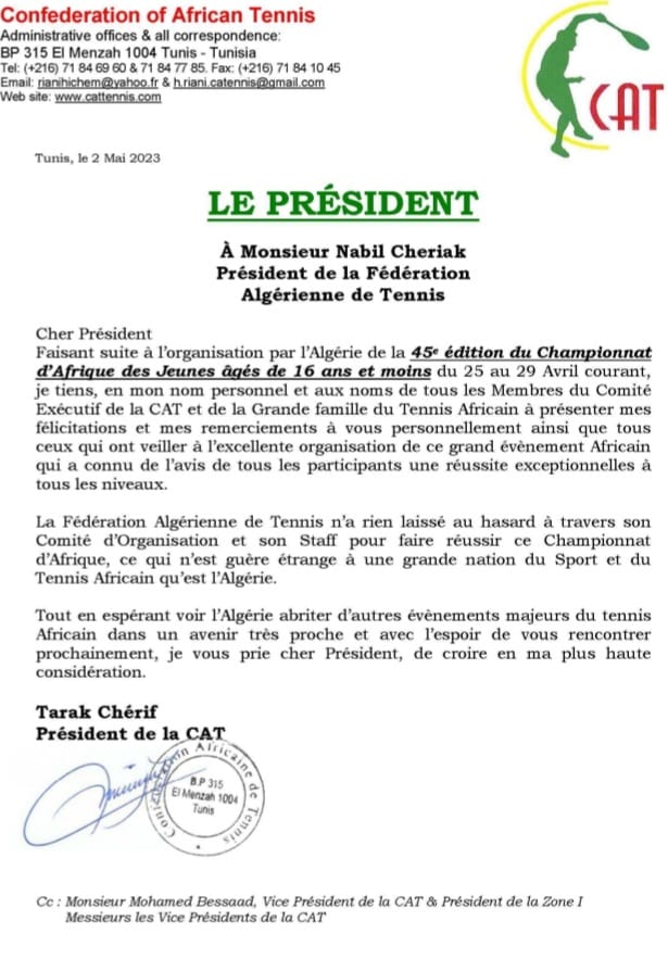 Le président de la Confédération Africaine de Tennis (CAT), M. Tarek Chérif félicite M. Nabil Chériak, président de la Fédération Algérienne de Tennis (FAT) pour l’excellente organisation du Championnat d’Afrique ITF/CAT des U16, clôturé Samedi au Tennis Club de Bachdjarah (Alger).