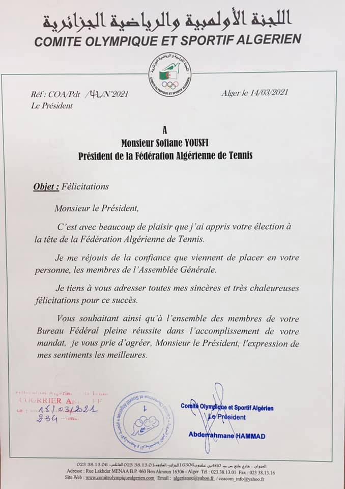 M. Abderrahmane Hammad, président du Comité Olympique et Sportif Algérien, a adressé une lettre de félicitations à M. Sofiane Yousfi suite à son élection au poste du Président de la Fédération Algérienne de Tennis.